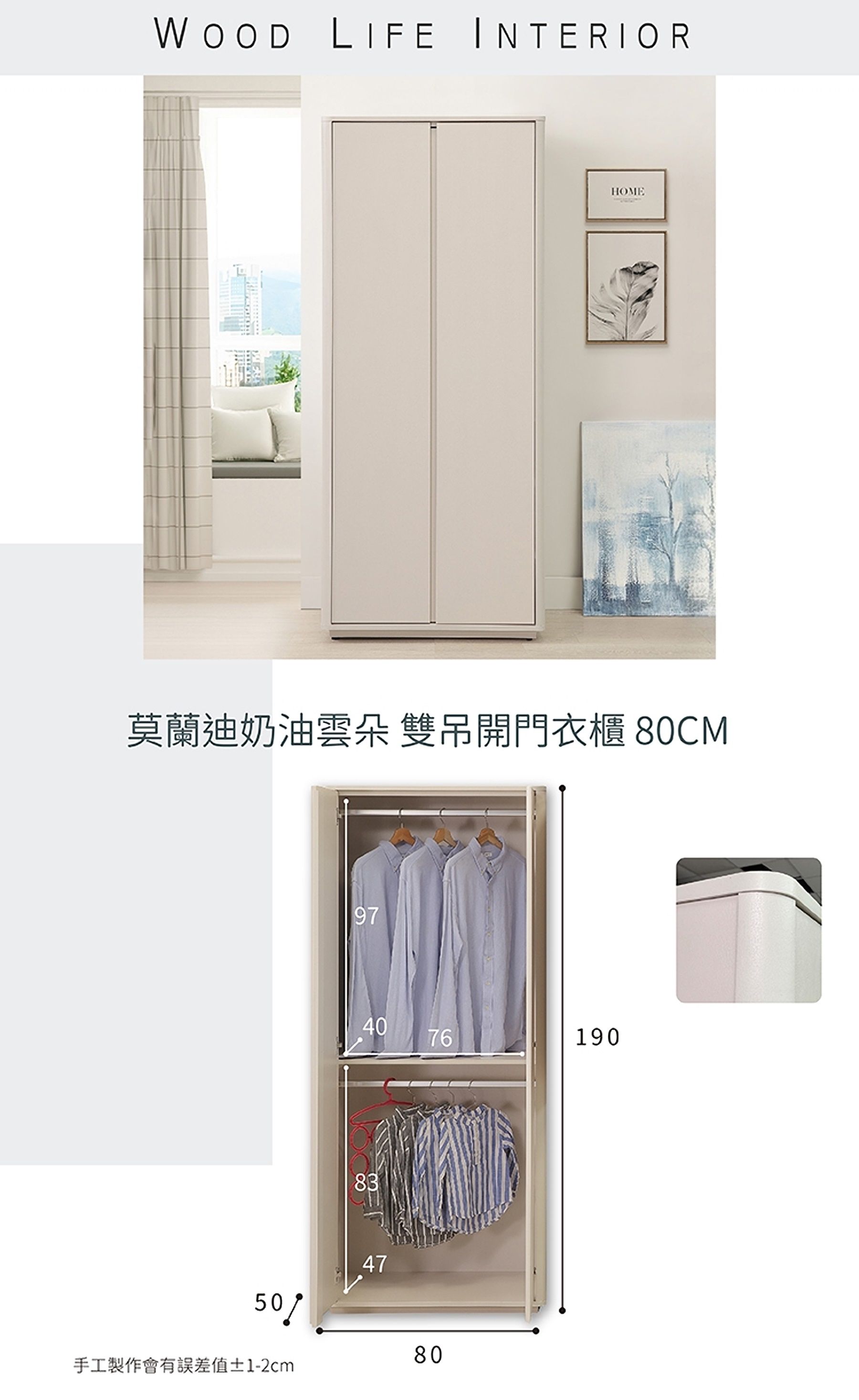 莫蘭迪奶油雲朵80CM雙吊開門衣櫃