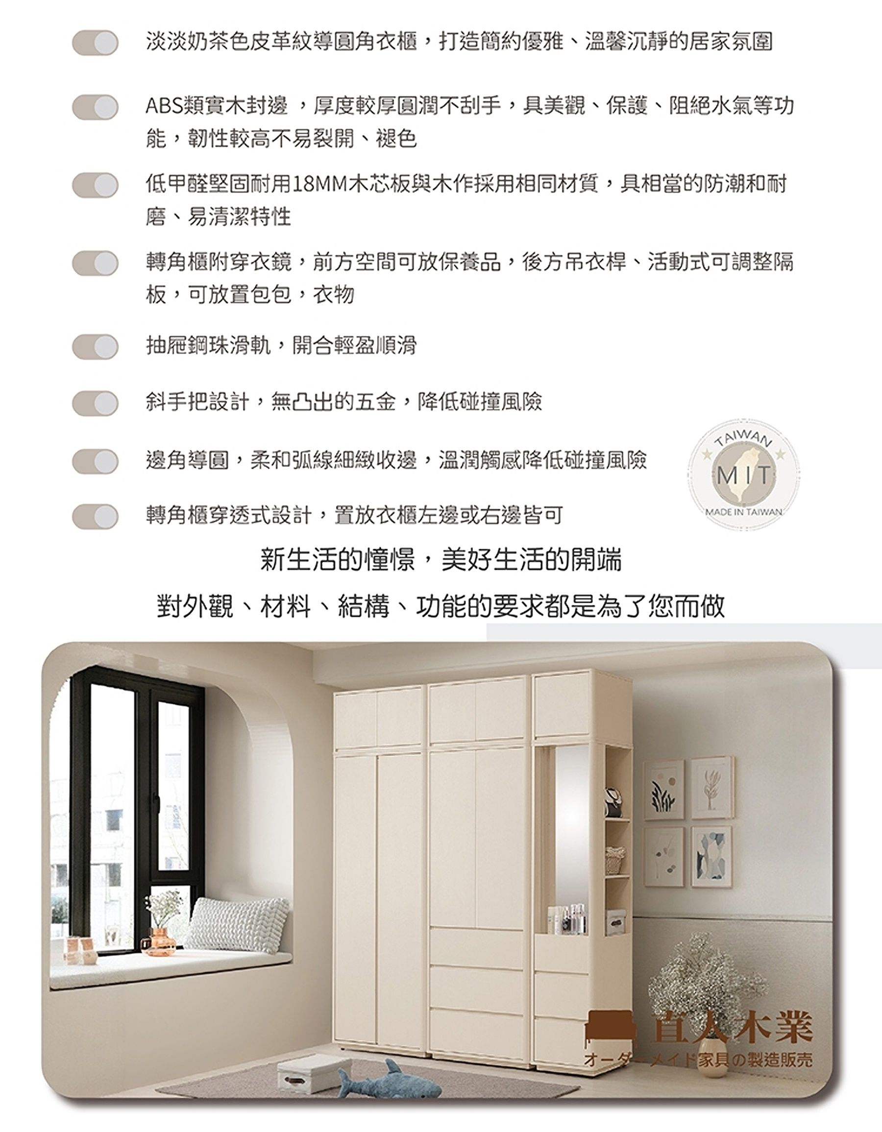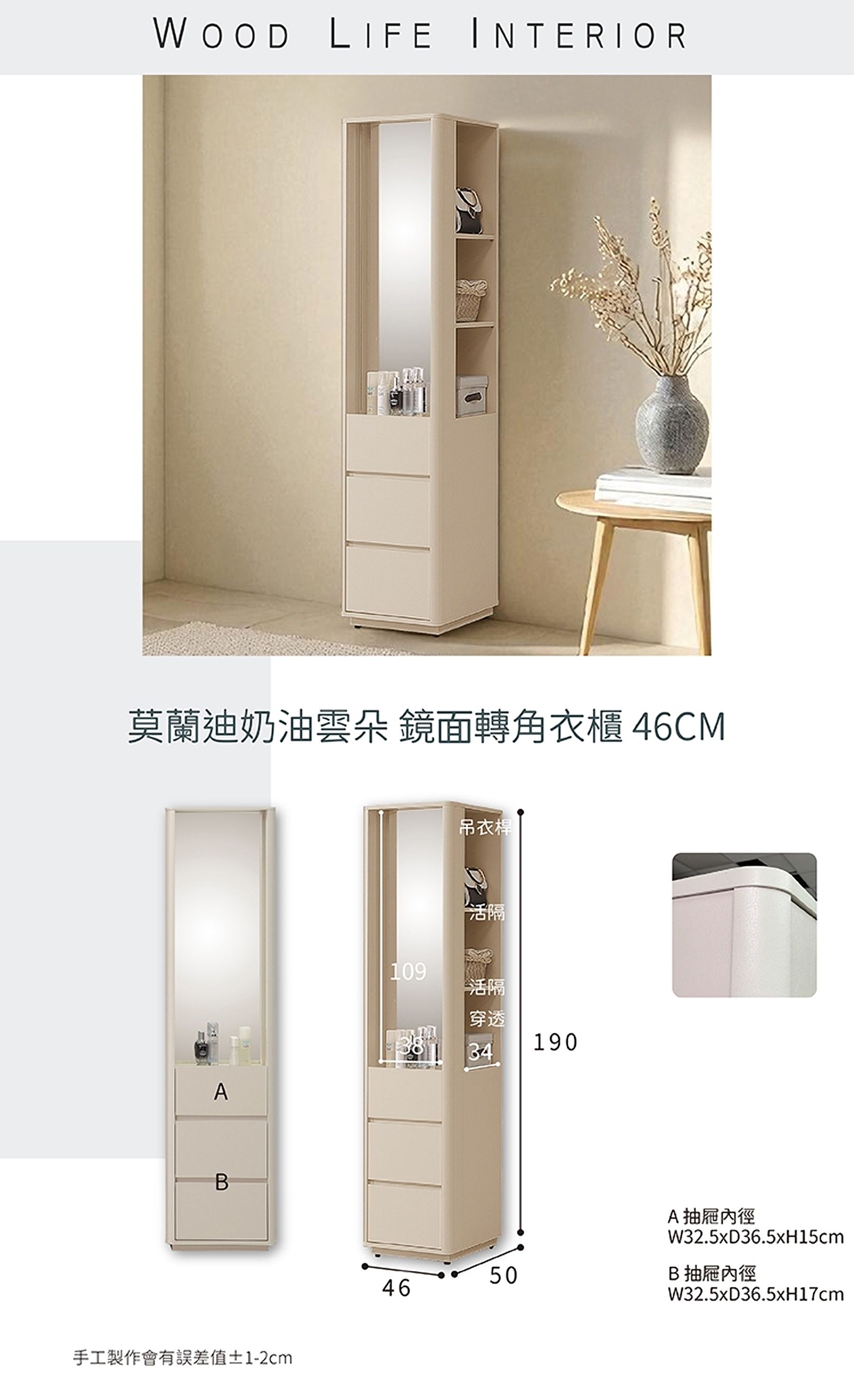 莫蘭迪奶油雲朵46CM鏡面轉角衣櫃