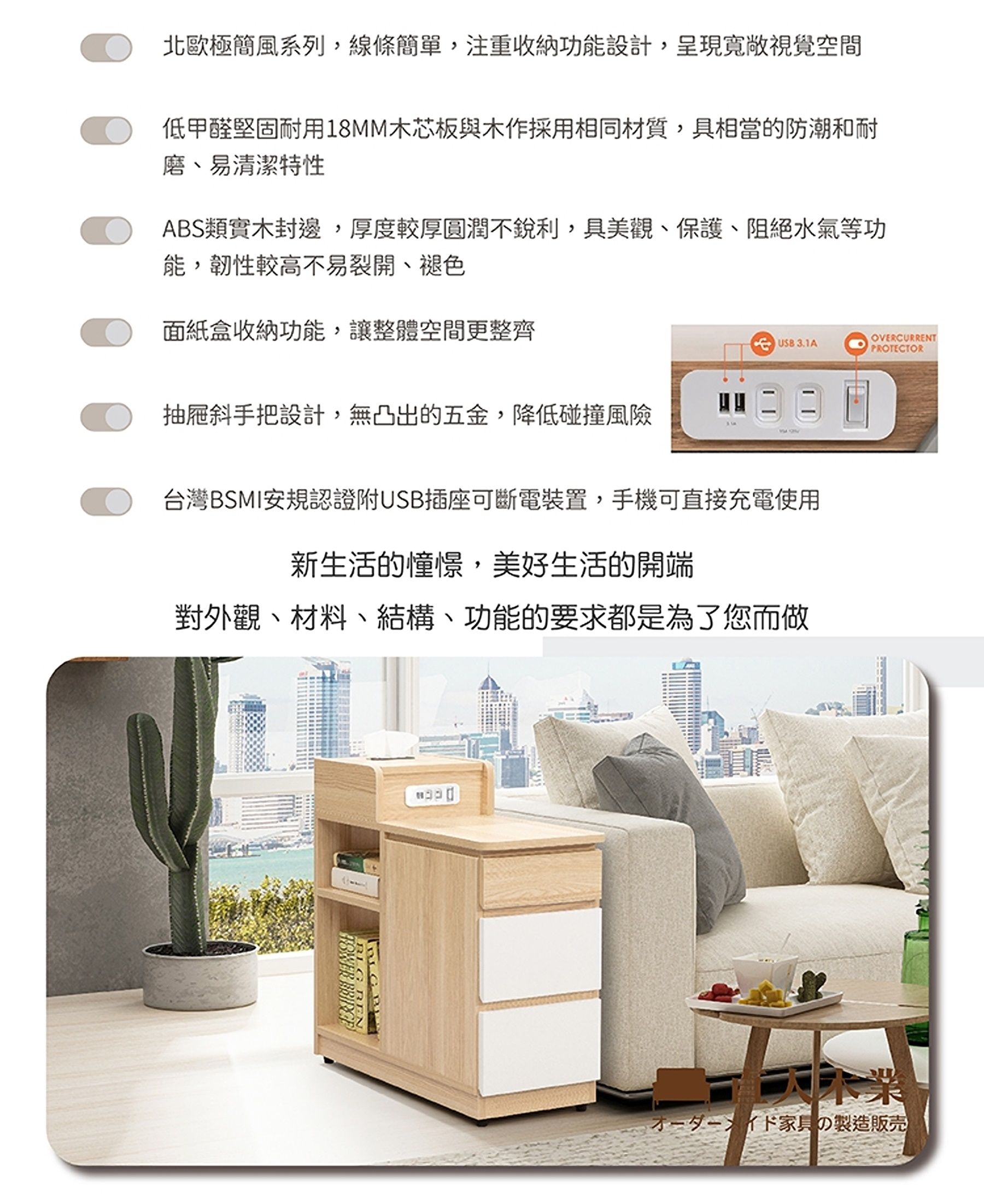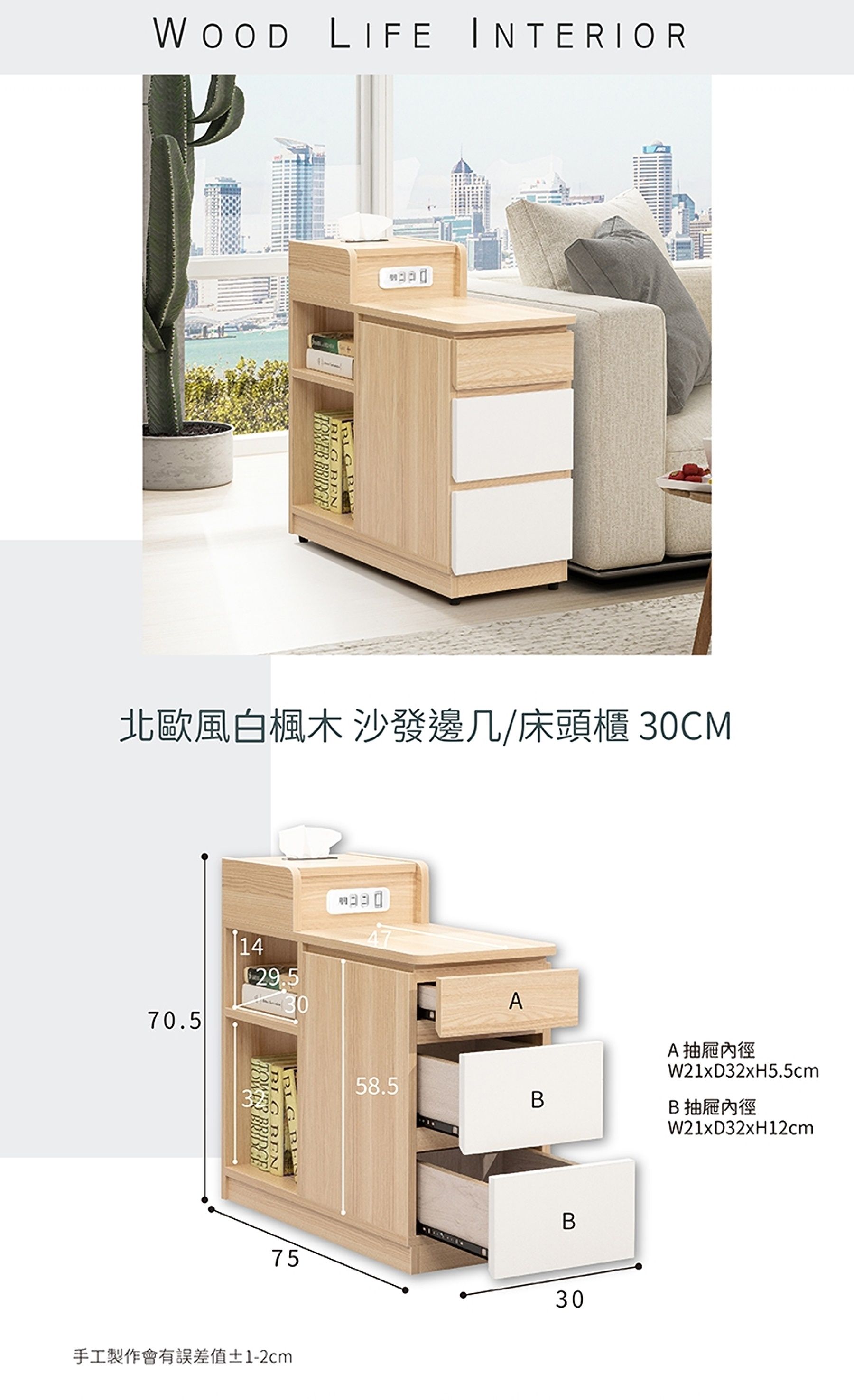 北歐風白楓木30CM沙發邊几/床頭櫃
