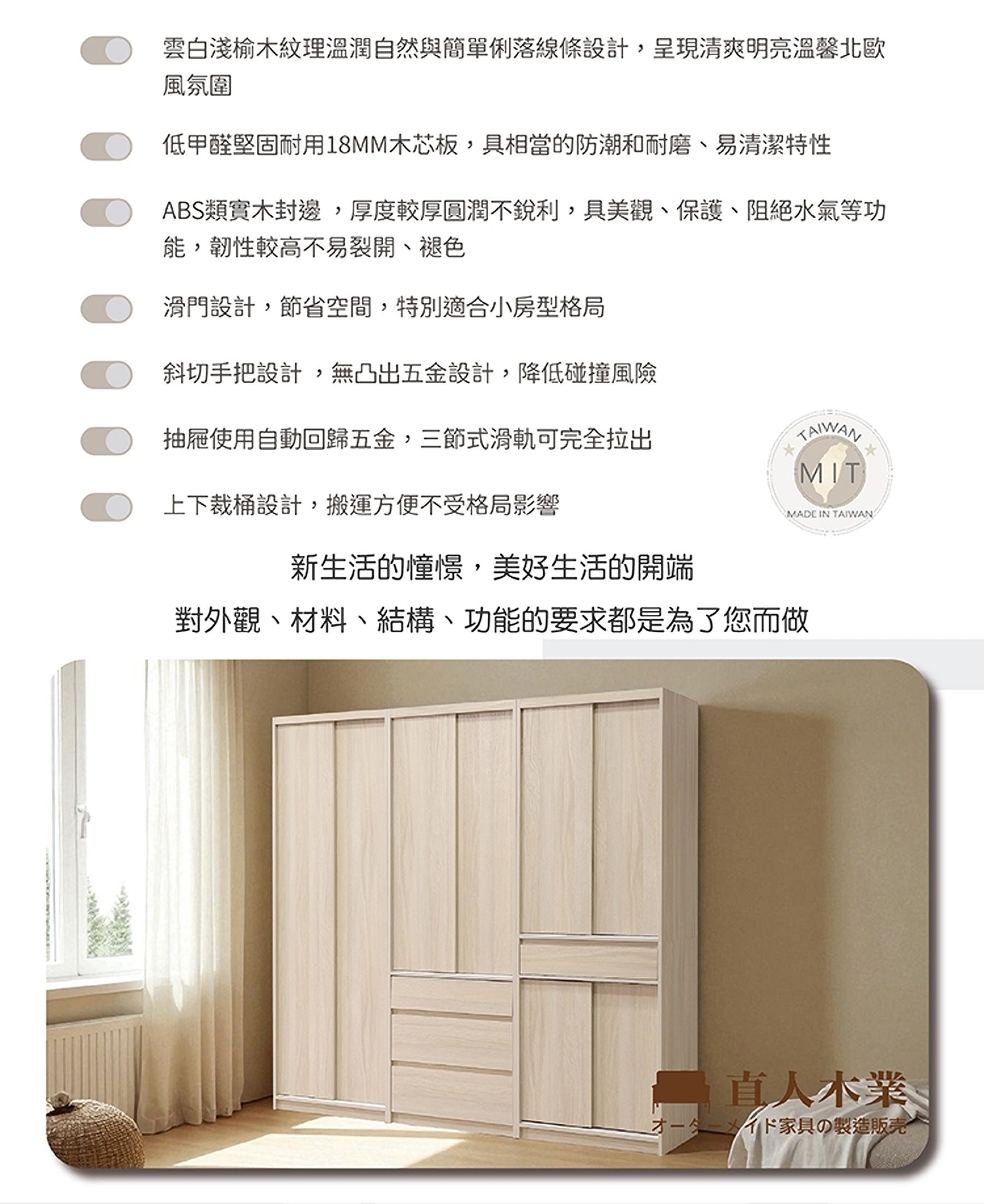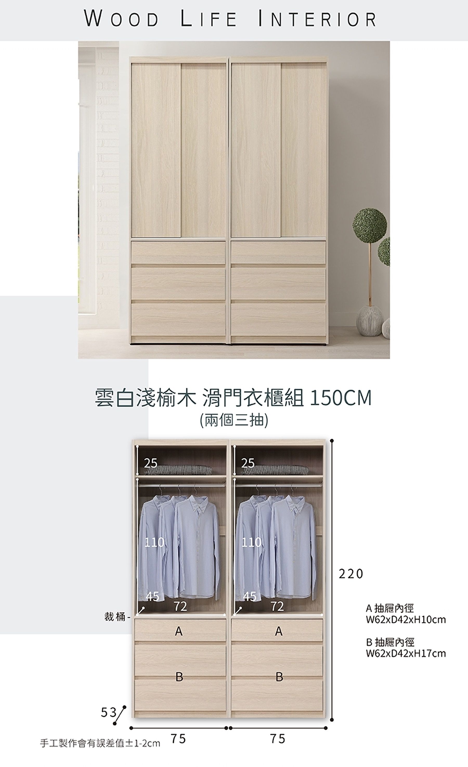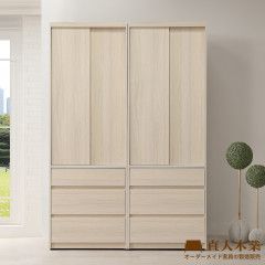 雲白淺榆木150CM滑門衣櫃組 (三抽+三抽)