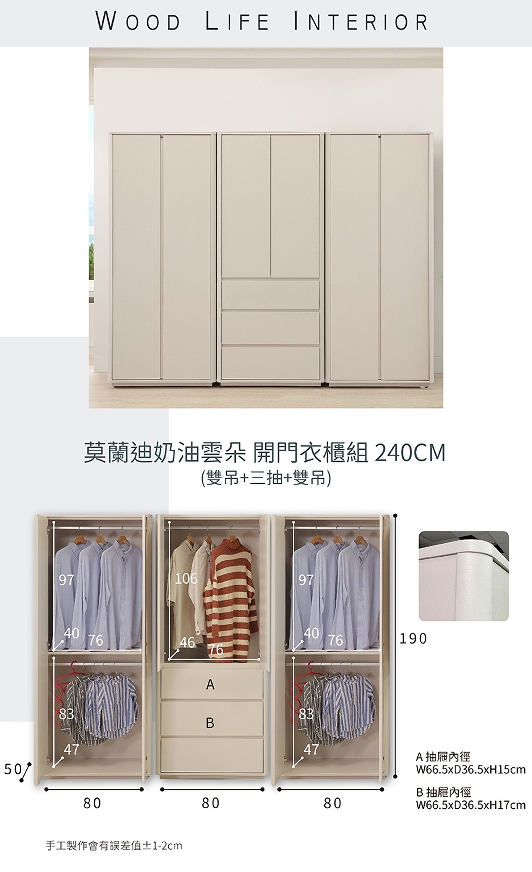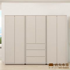 莫蘭迪奶油雲朵240CM開門衣櫃組 (雙吊+三抽+雙吊)