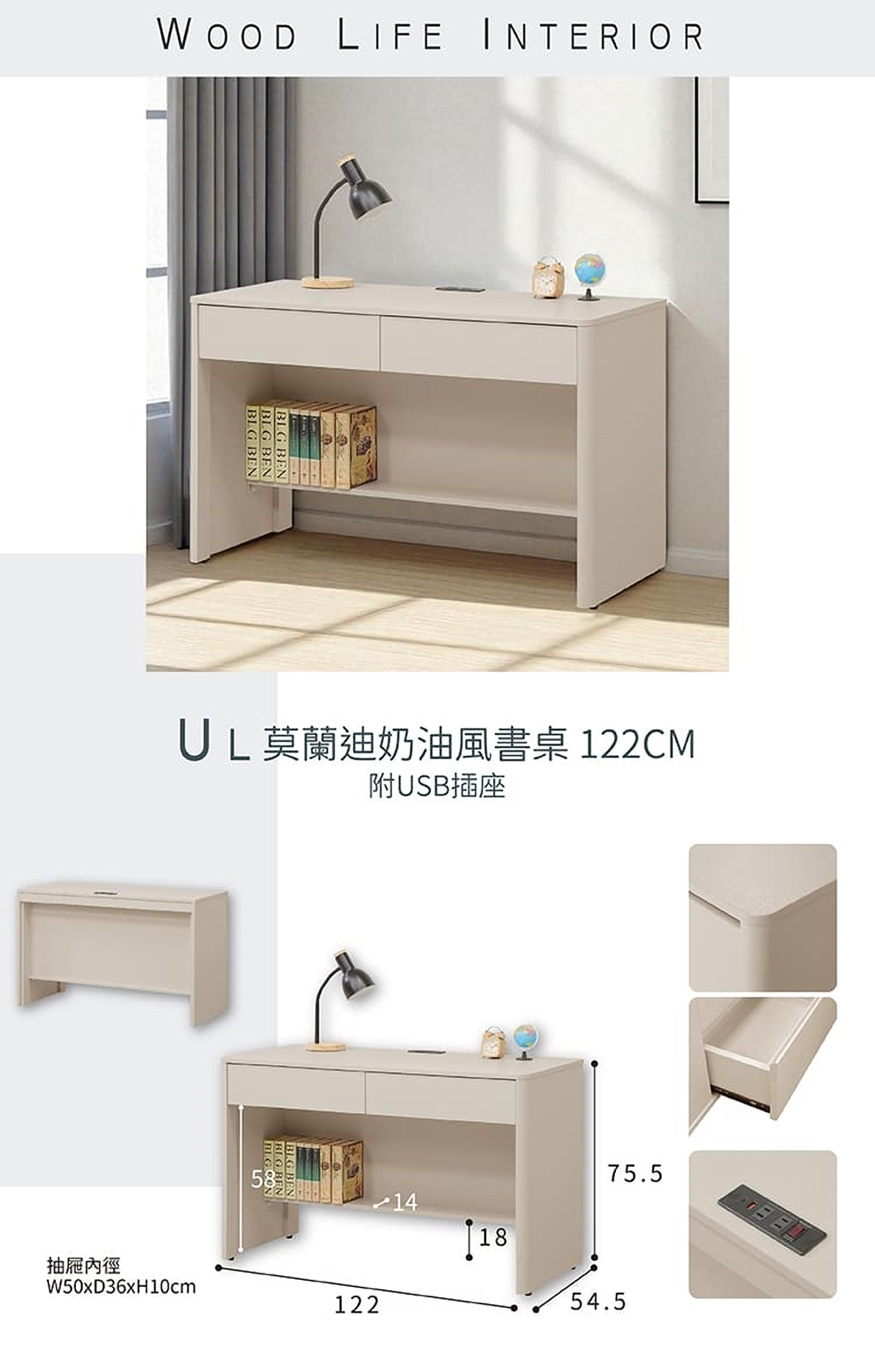 UL 莫蘭迪奶油風122CM書桌 (附USB插座)