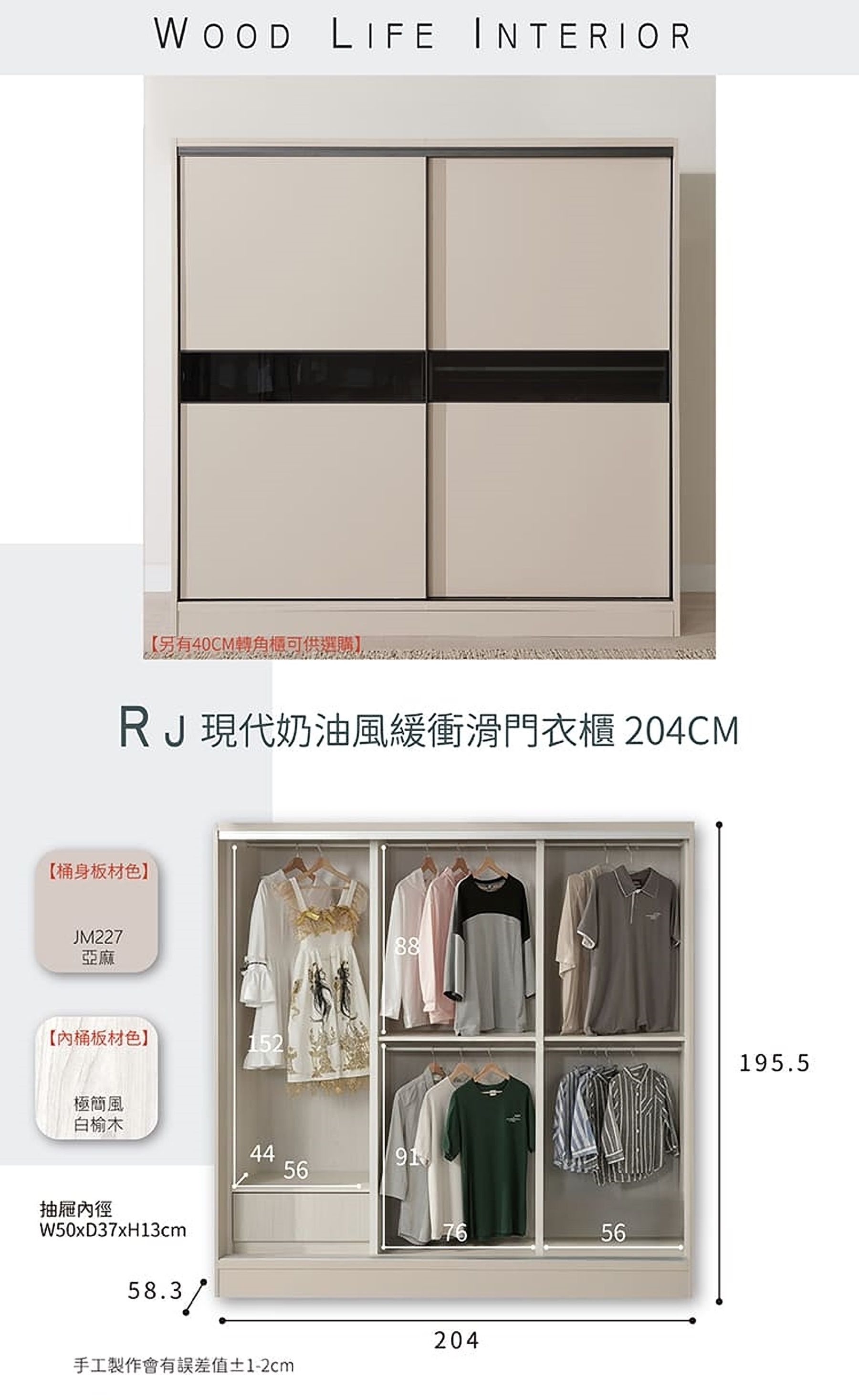 【限定門市選購】RJ現代奶油風204CM緩衝滑門衣櫃