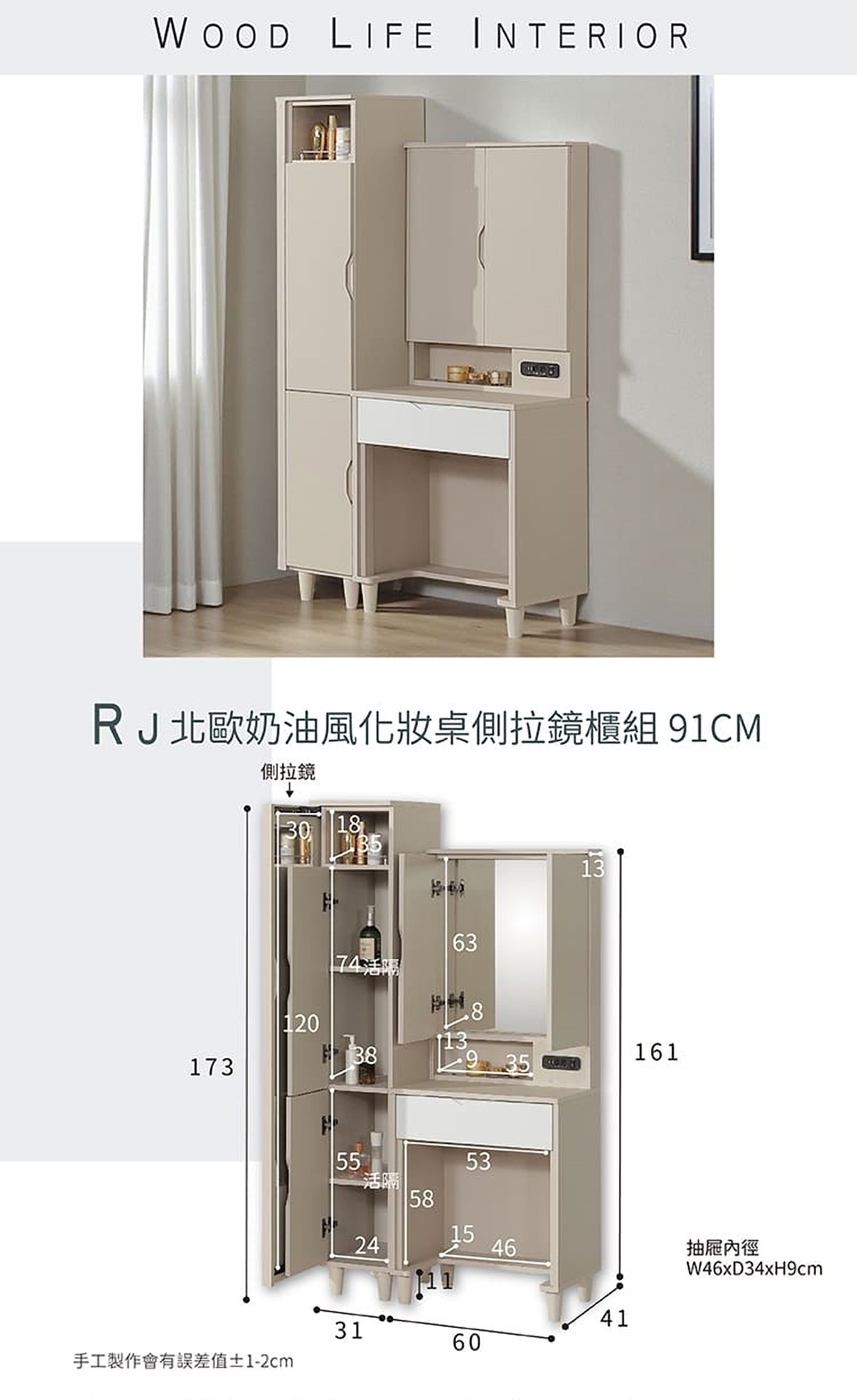 RJ 北歐奶油風91CM側拉鏡化妝桌組