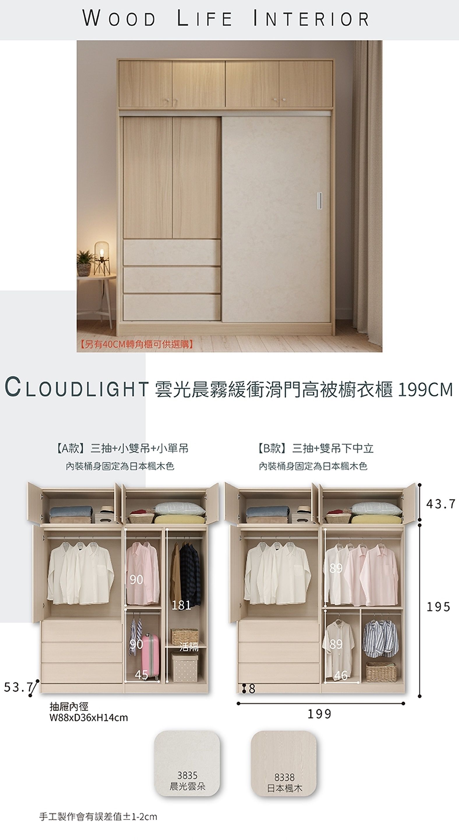 【限定門市選購】CLOUDLIGHT 雲光晨霧199CM緩衝滑門高被櫥衣櫃