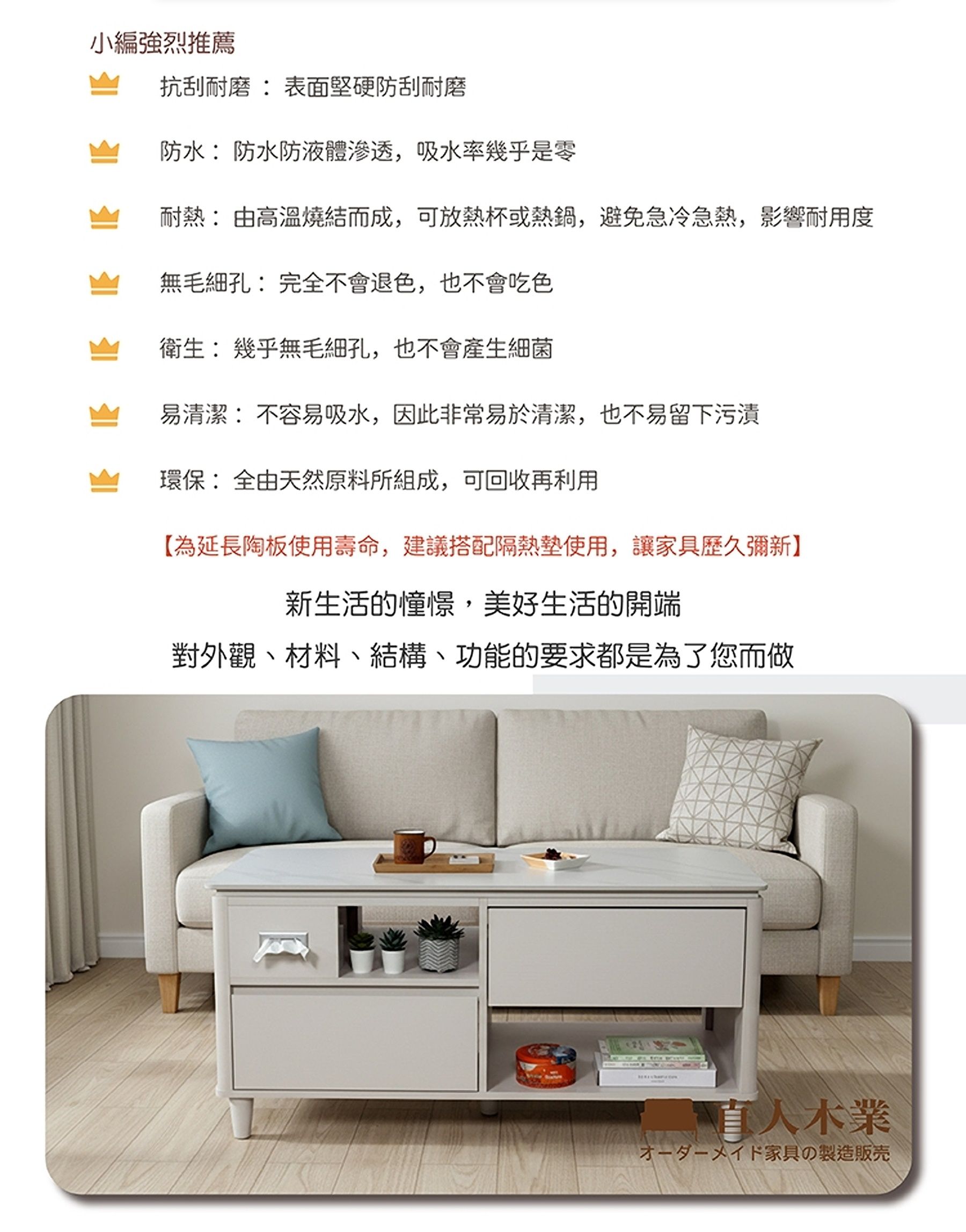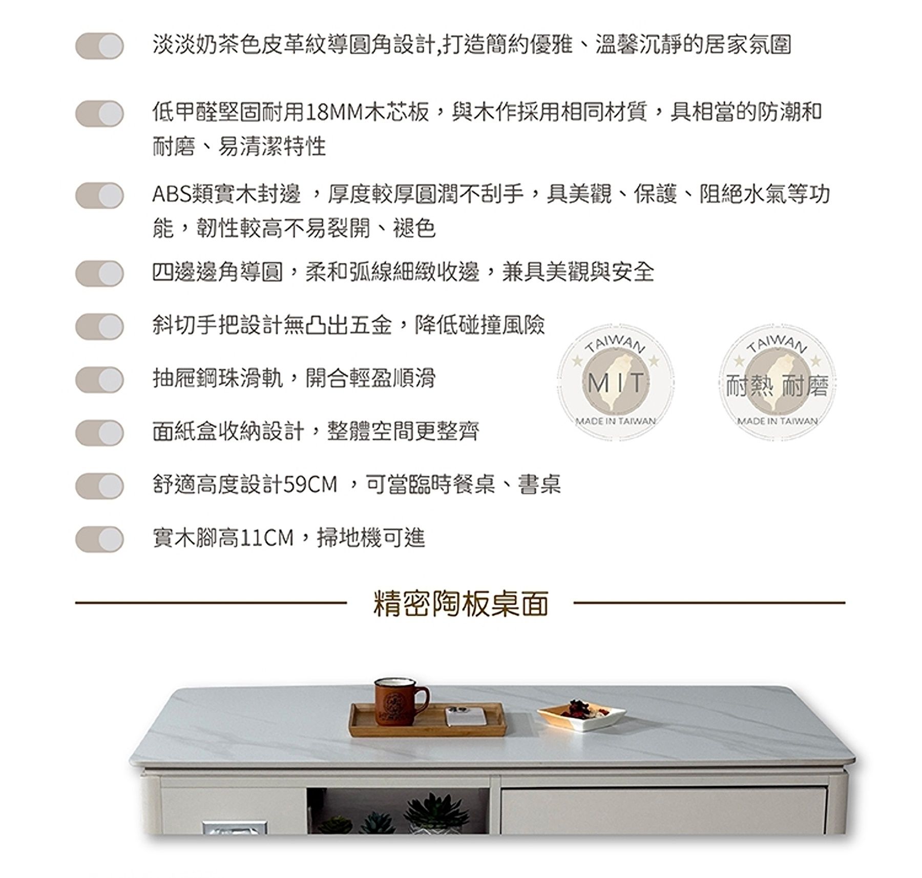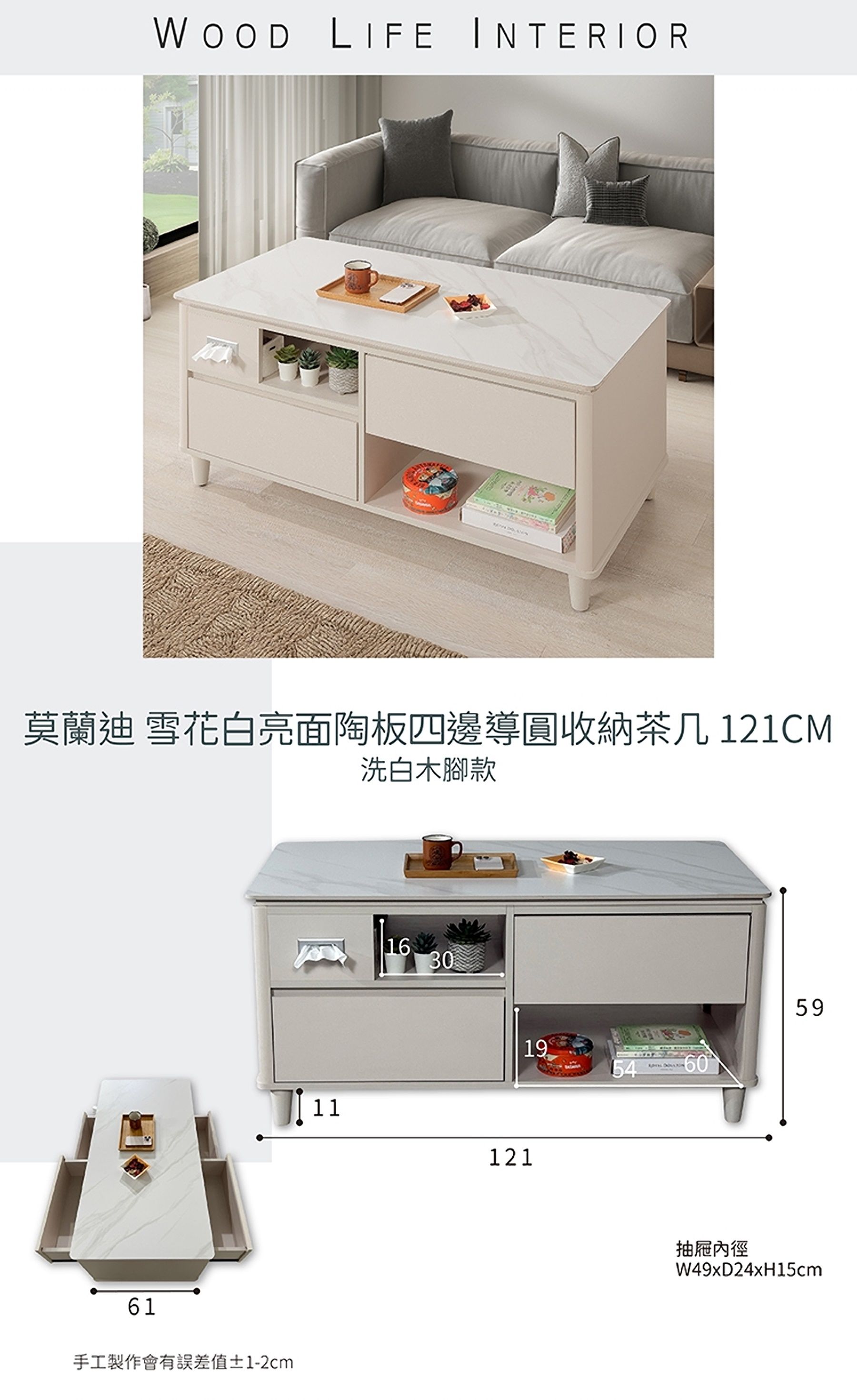 莫蘭迪雪花白亮面陶板四邊導圓121CM收納茶几 (洗白木腳)