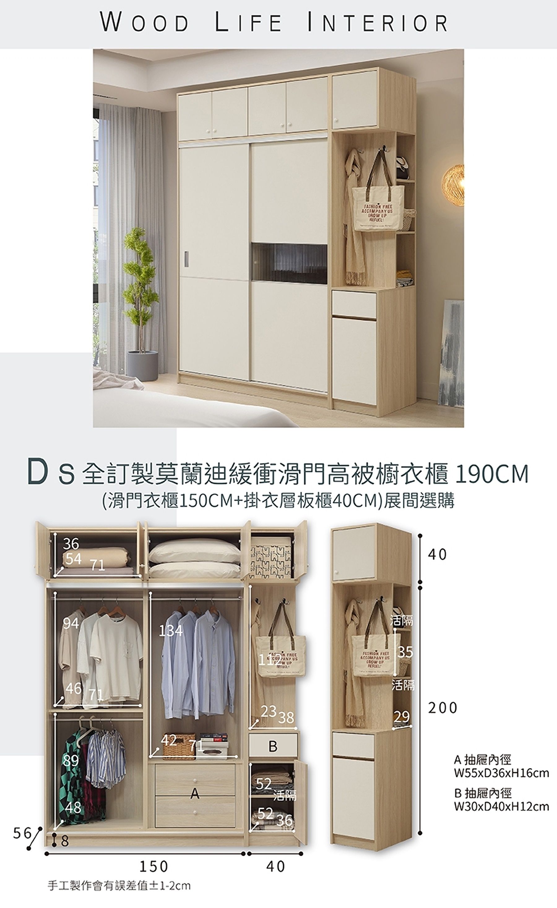 【限定門市選購】DS 全訂製蘭迪緩衝190CM高被櫥滑門衣櫃 (150CM滑門衣櫃+40CM掛衣層板櫃)
