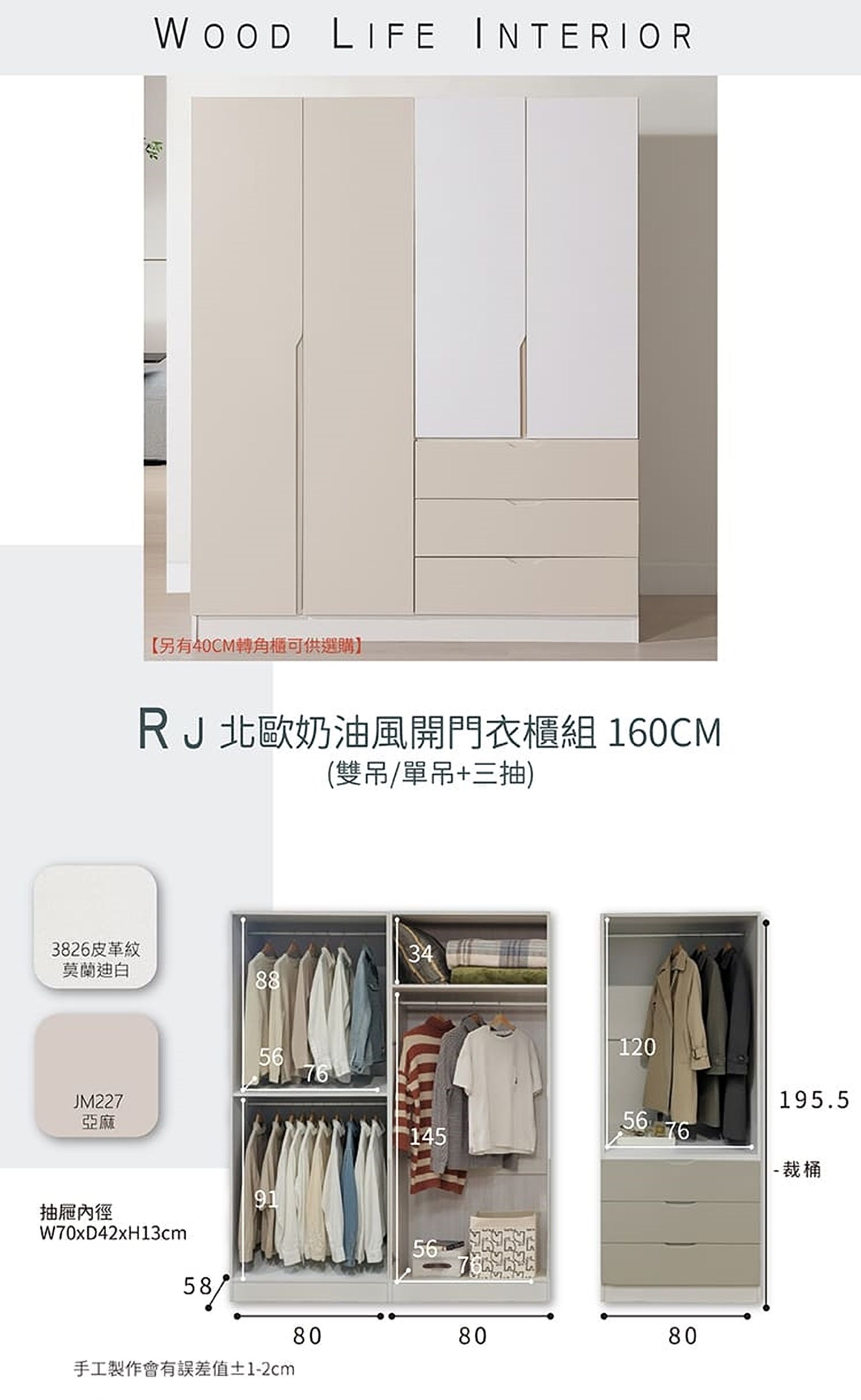 【限定門市選購】RJ北歐奶油風160CM開門衣櫃組 (單吊/雙吊+三抽)