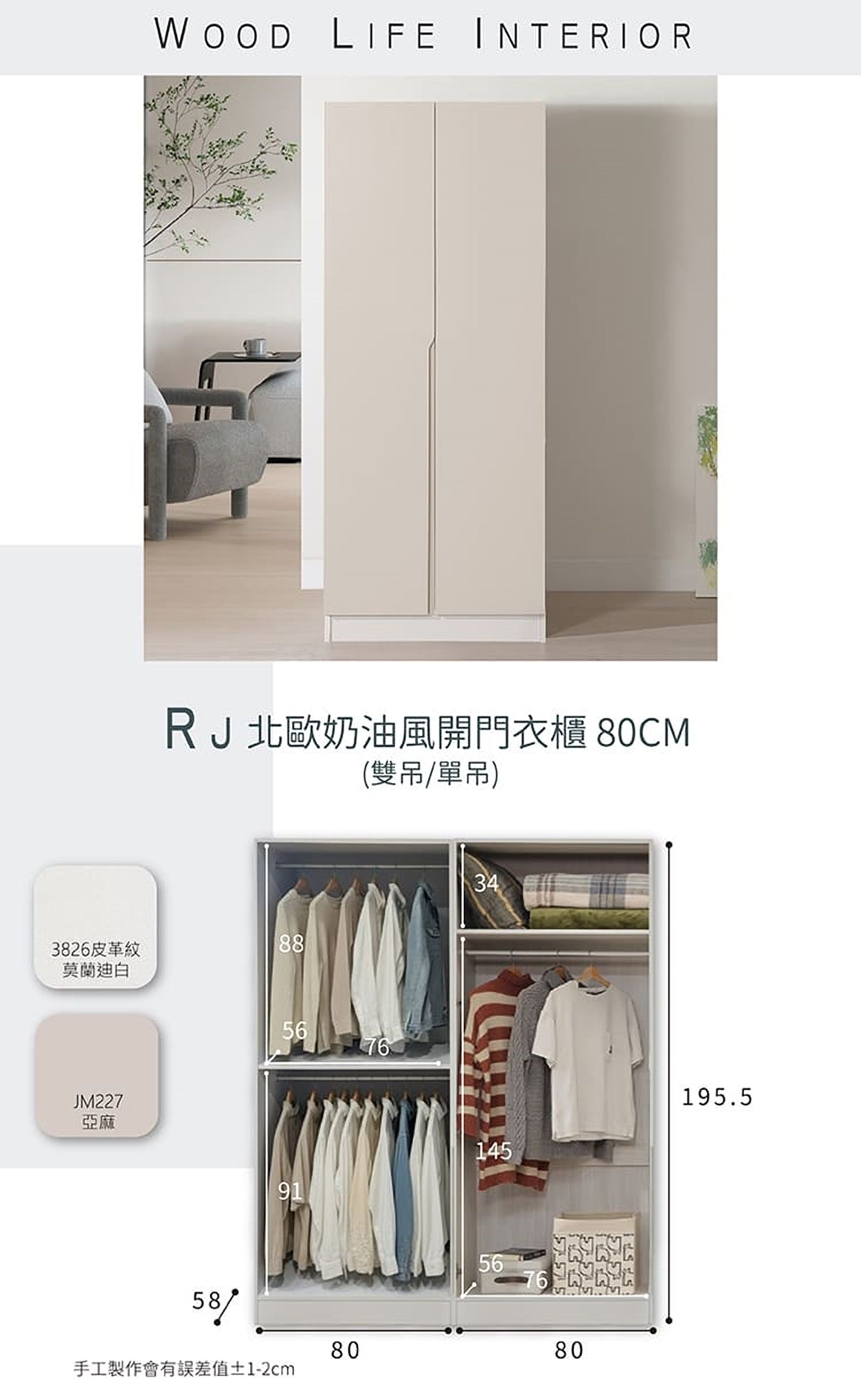 【限定門市選購】RJ北歐奶油風80CM開門衣櫃 (單吊/雙吊)