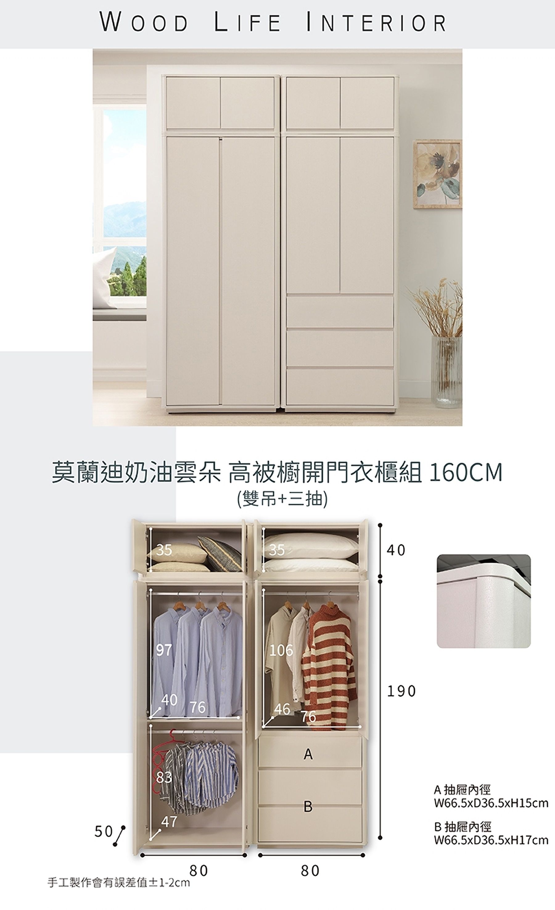 莫蘭迪奶油雲朵160CM開門高被櫥衣櫃組 (雙吊+三抽)