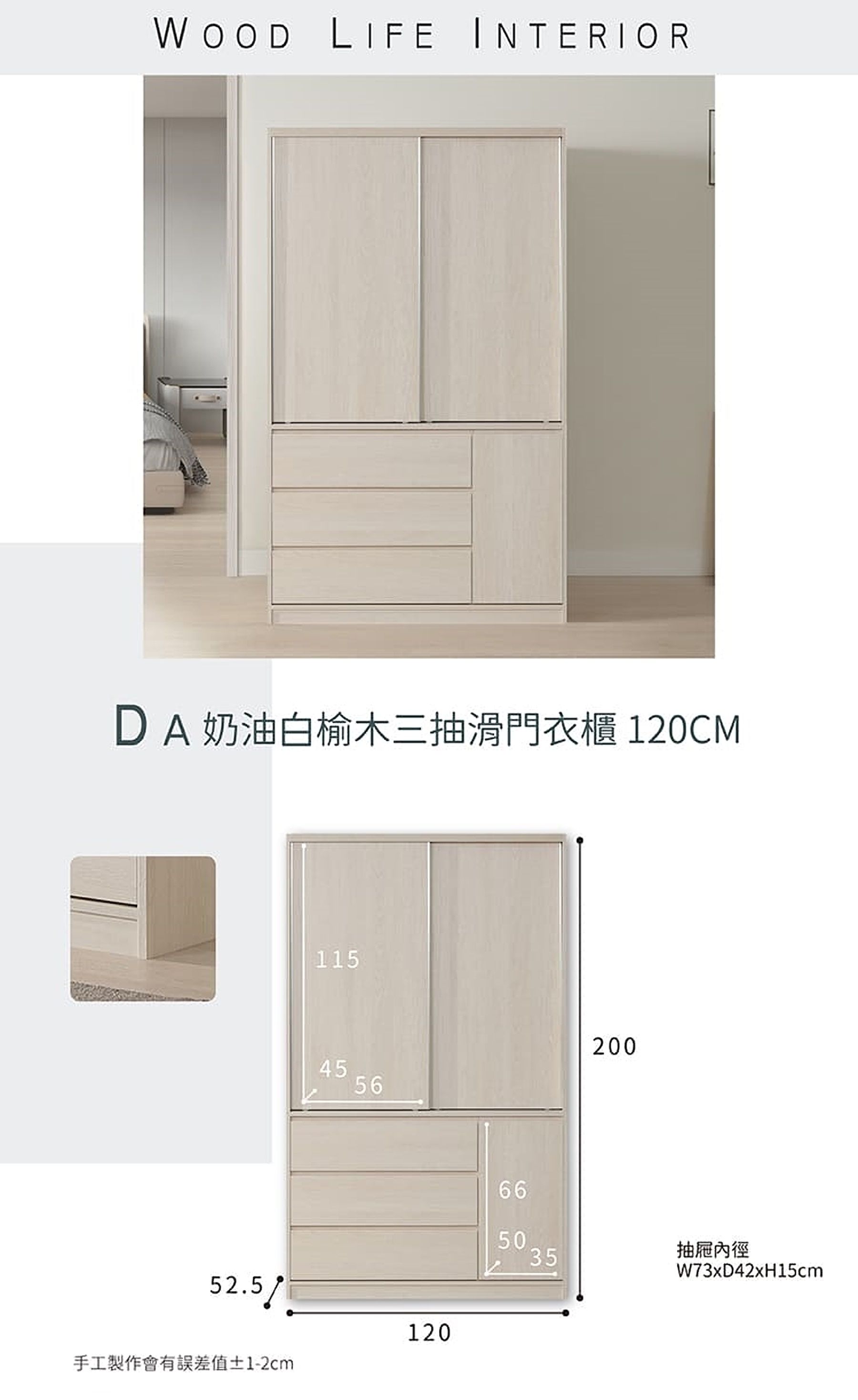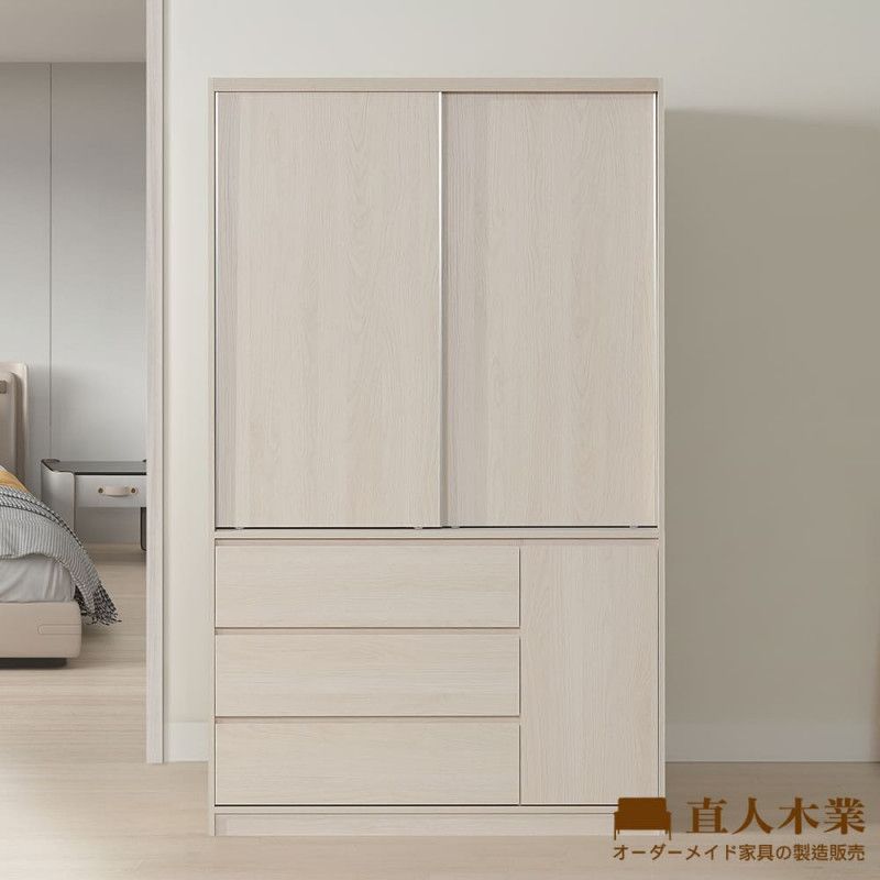 DA 奶油白榆木120CM三抽滑門衣櫃