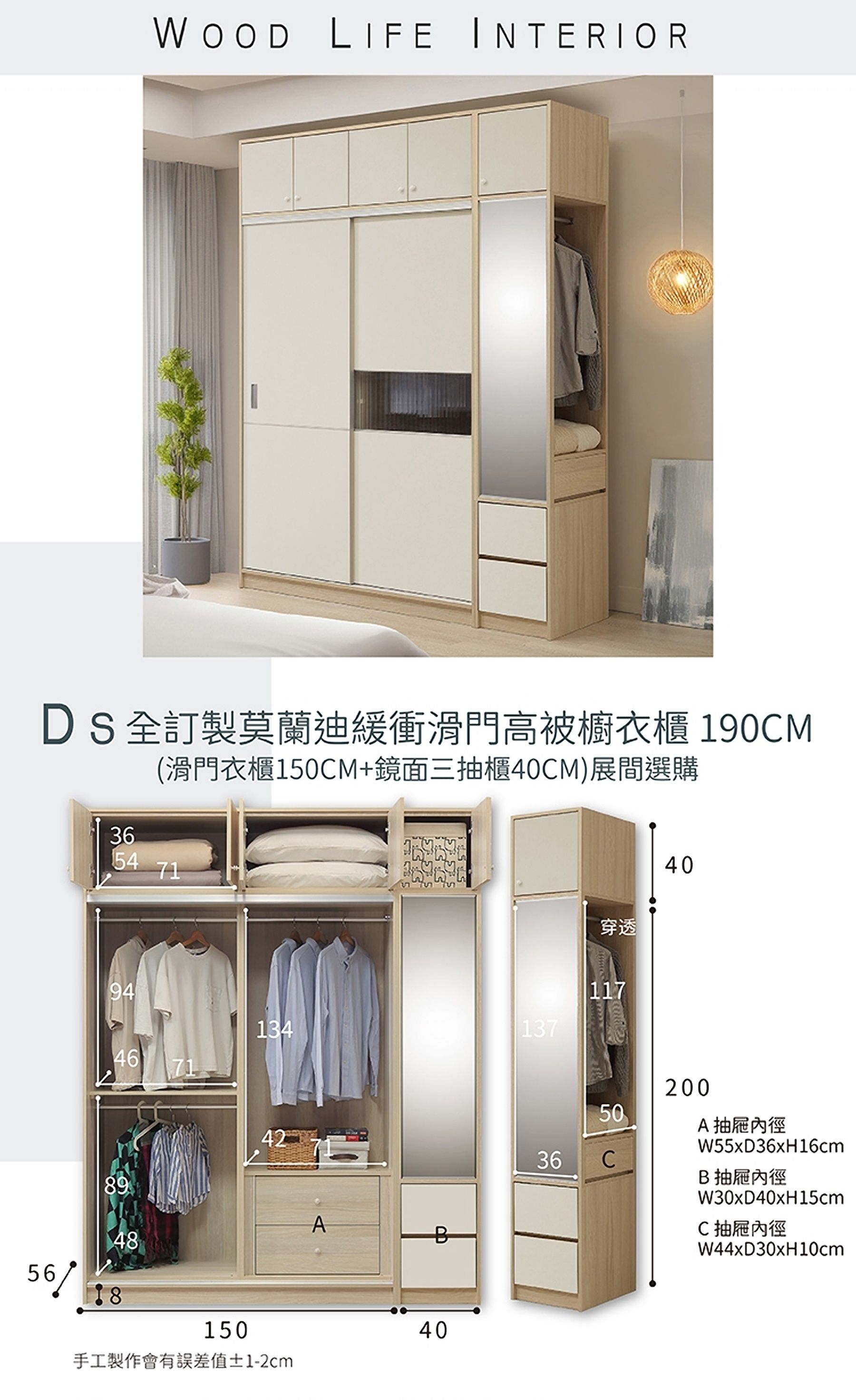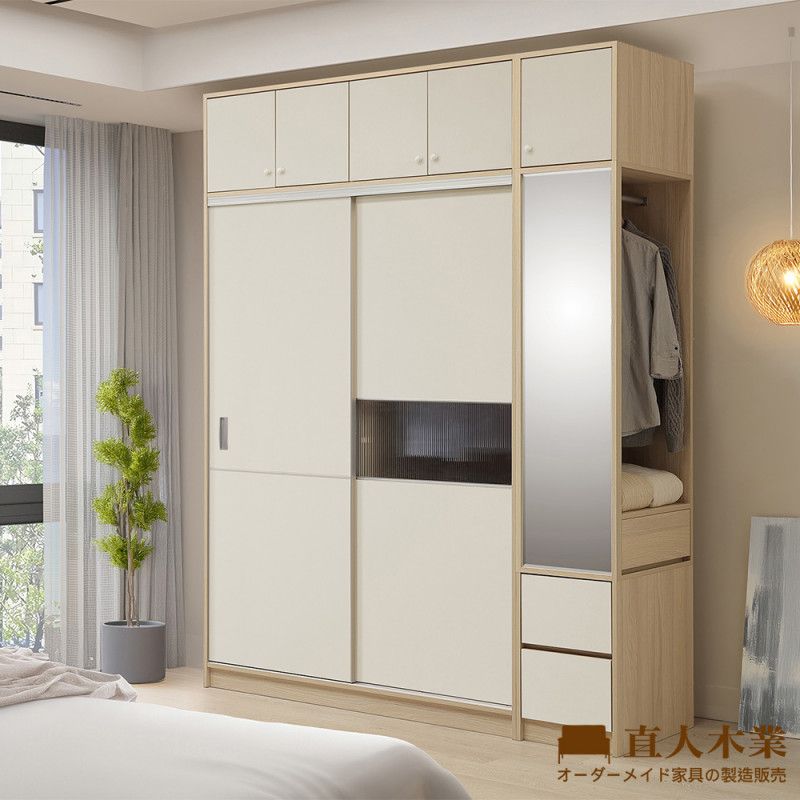 【限定門市選購】DS 全訂製蘭迪緩衝190CM高被櫥滑門衣櫃 (150CM滑門衣櫃+40CM鏡面三抽櫃)