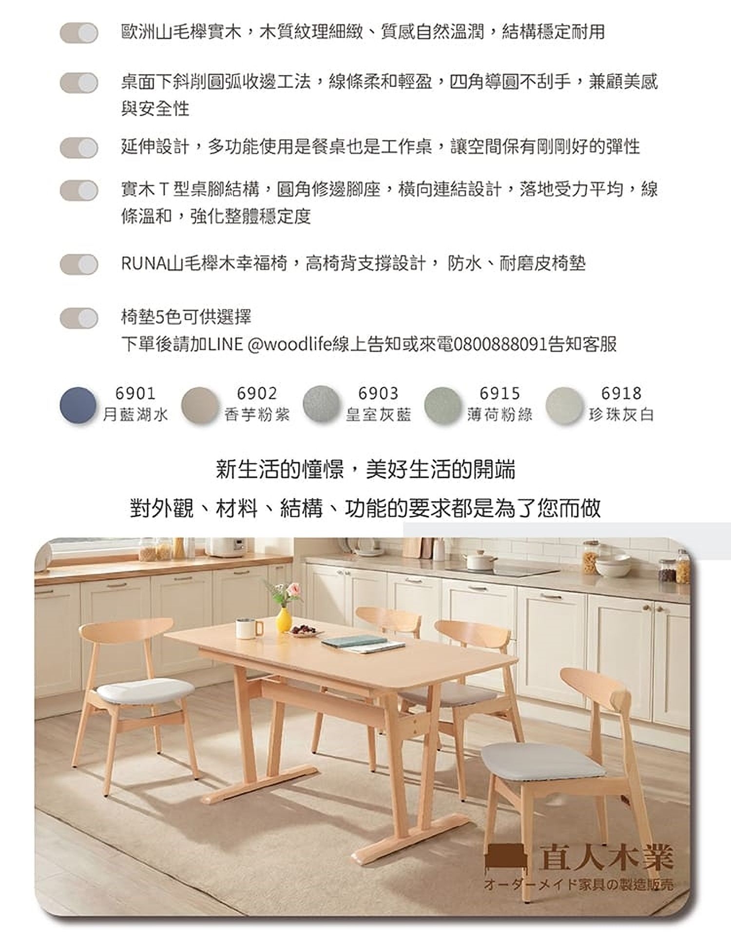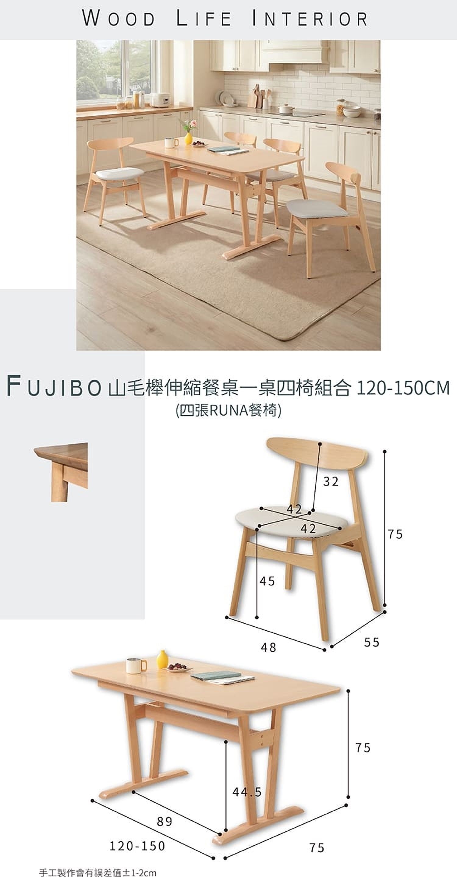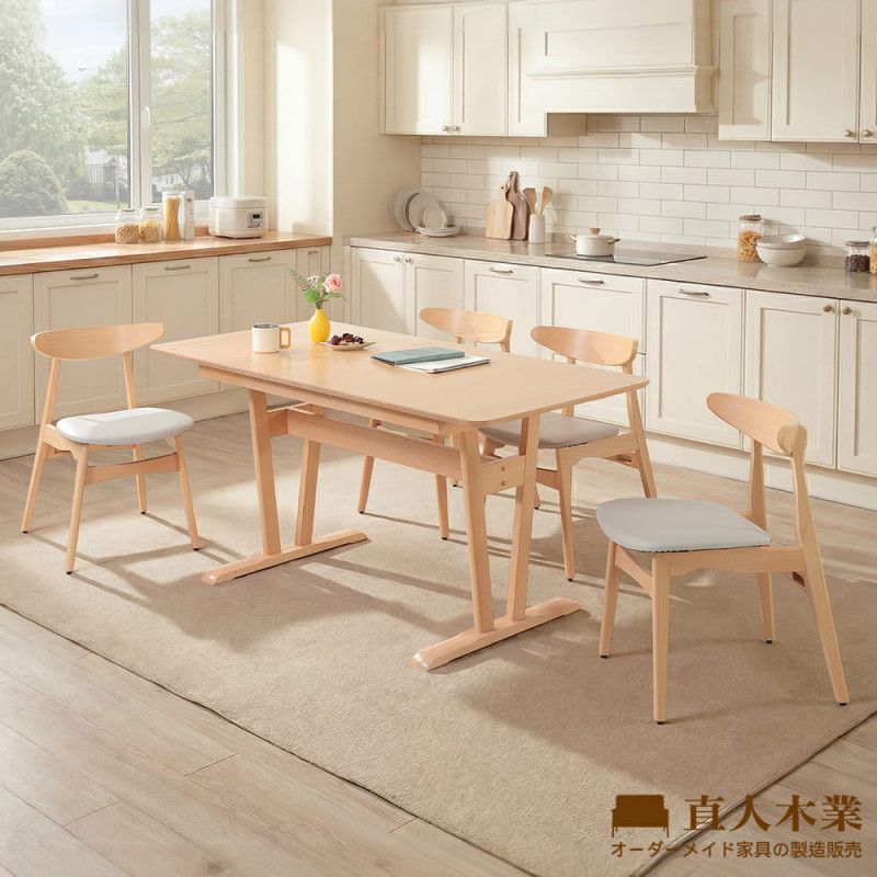FUJIBO 日系山毛櫸實木120-150CM伸縮餐桌一桌四椅組 (搭配RUNA餐椅4張)