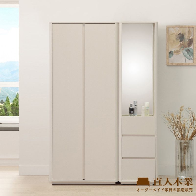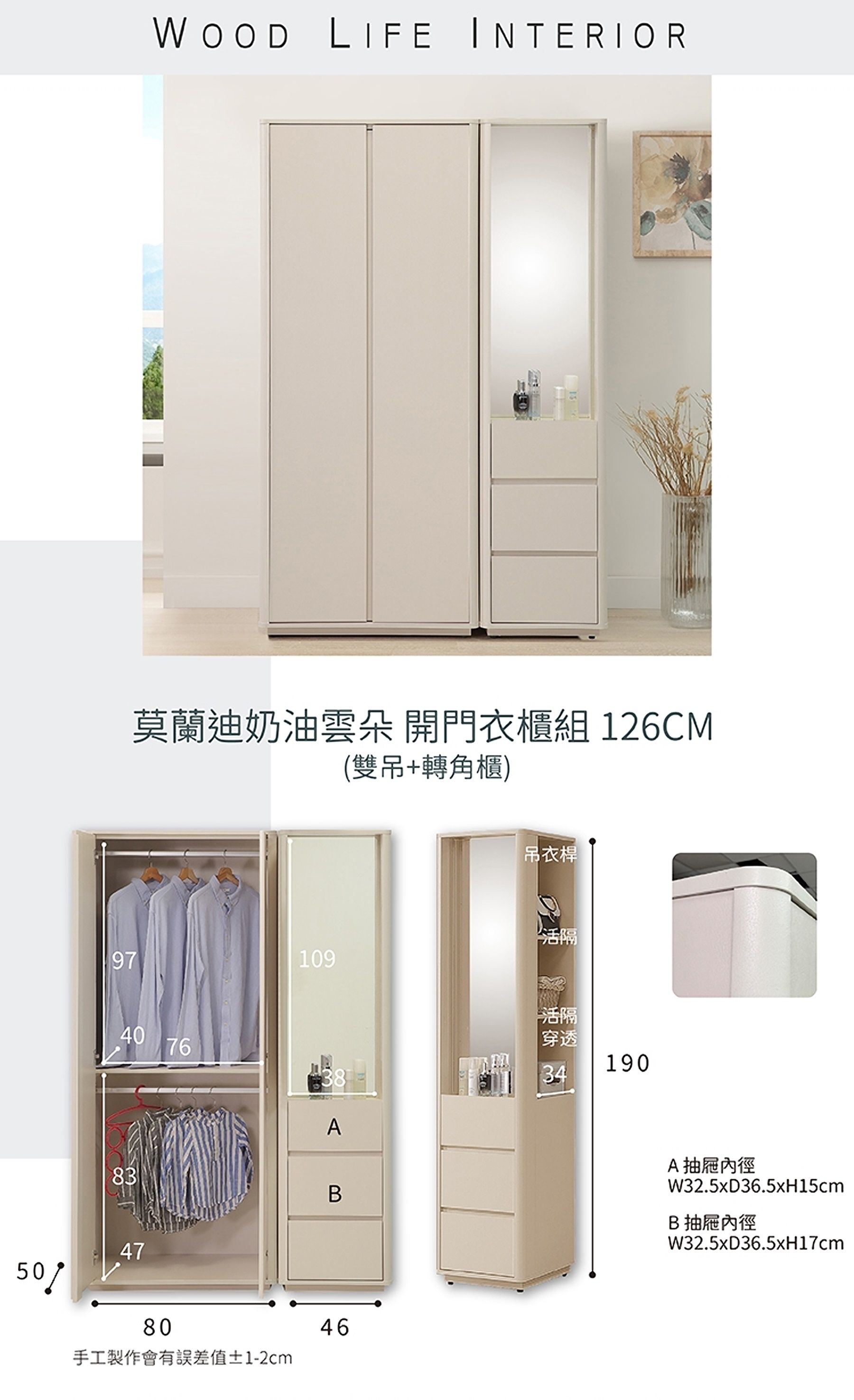 莫蘭迪奶油雲朵126CM開門衣櫃組 (雙吊+轉角櫃)