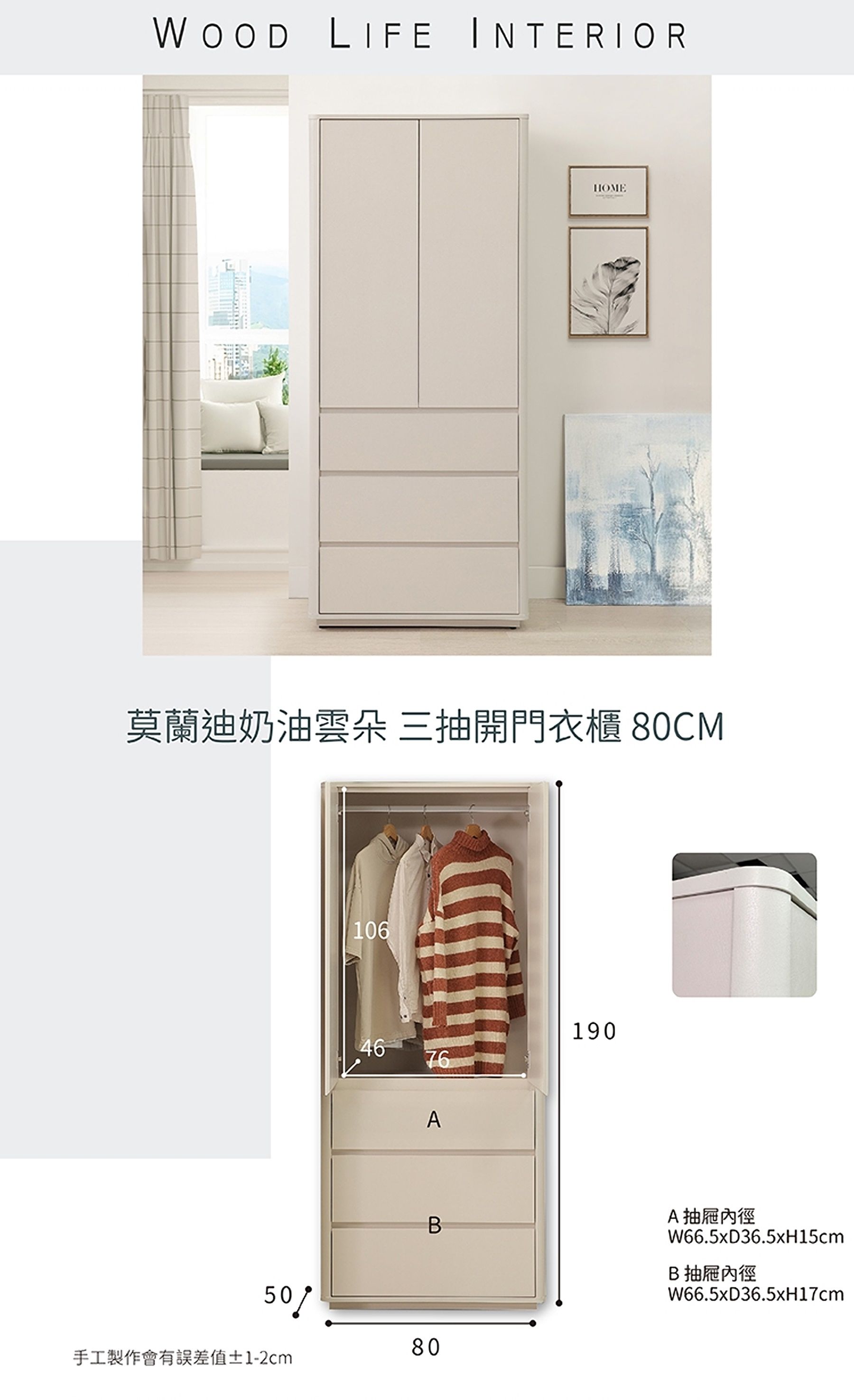 莫蘭迪奶油雲朵80CM三抽開門衣櫃