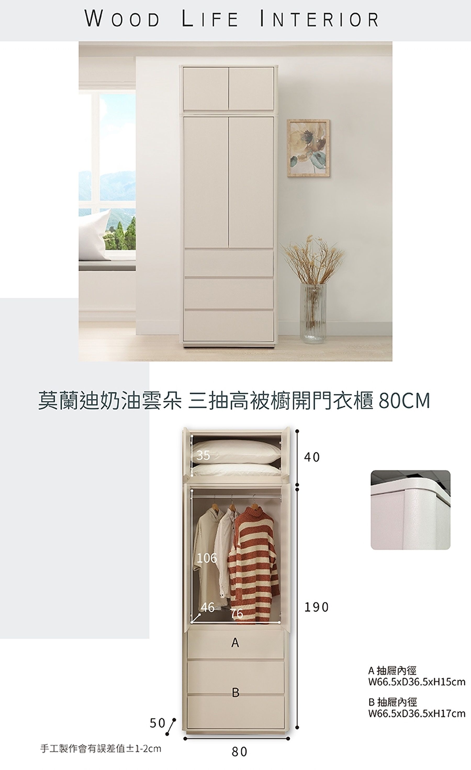 莫蘭迪奶油雲朵80CM三抽高被櫥開門衣櫃