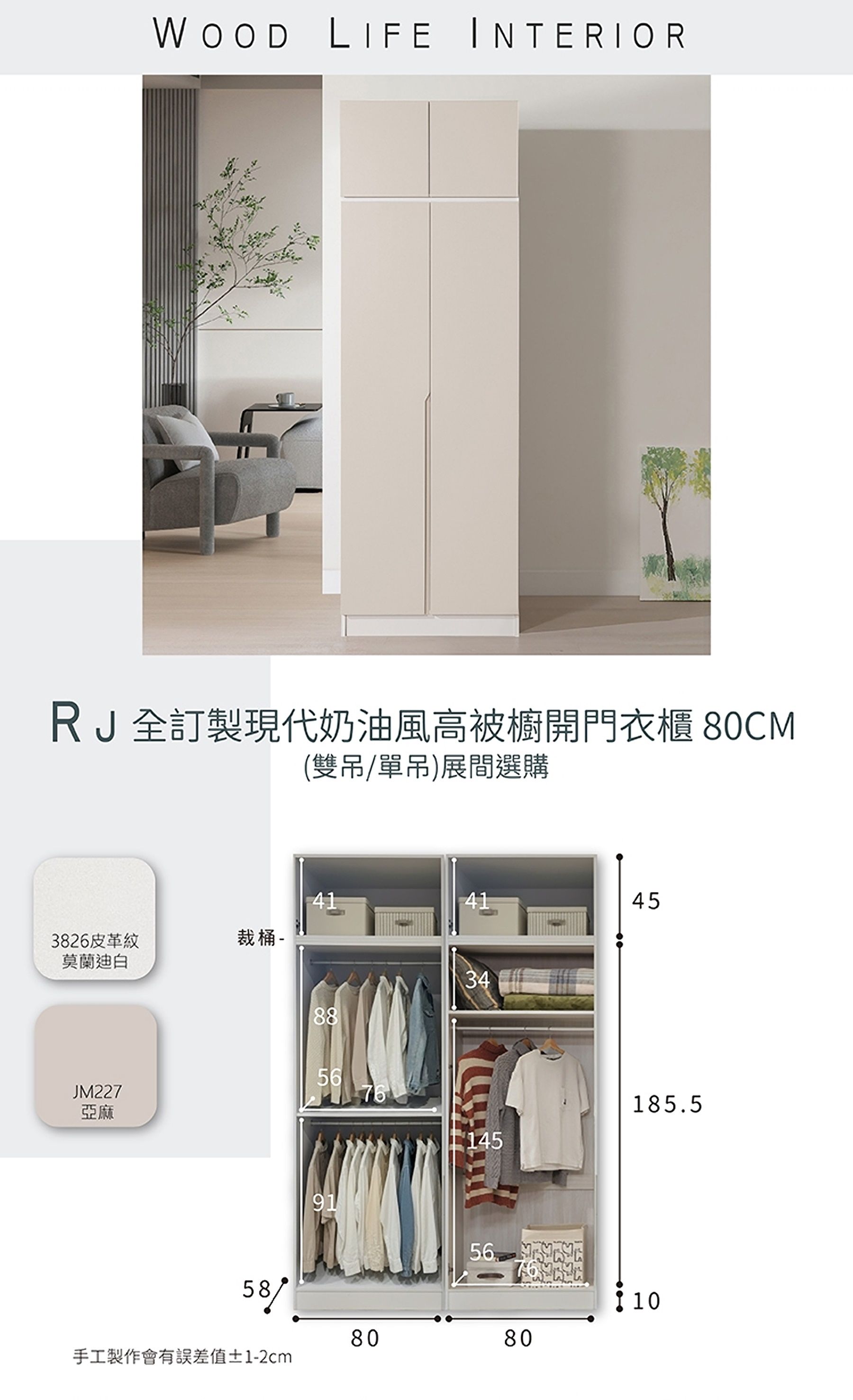 【限定門市選購】RJ 全訂製現代奶油風80CM高被櫥開門衣櫃 (單吊/雙吊)
