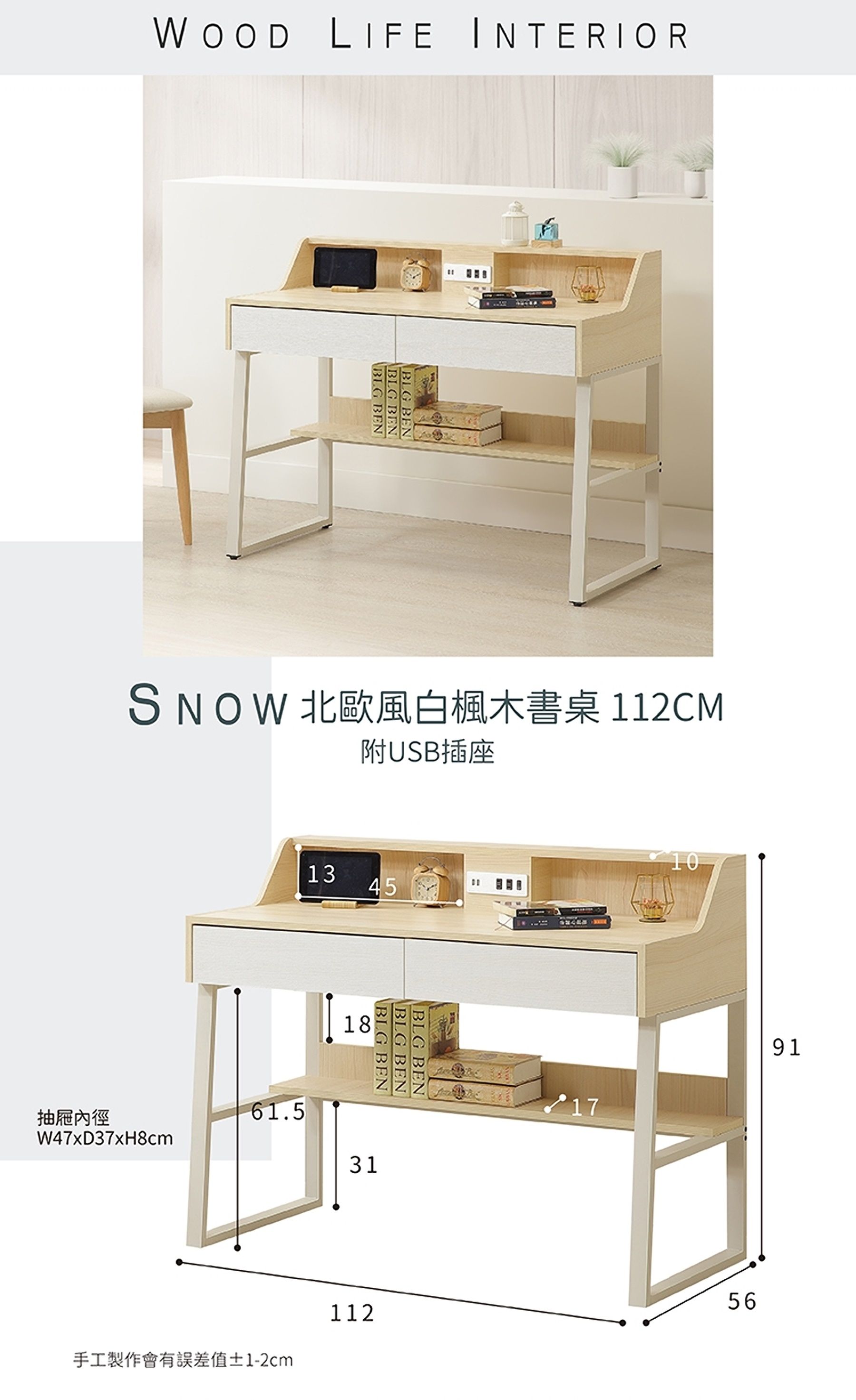SNOW北歐風白楓木書桌112公分(附USB插座)