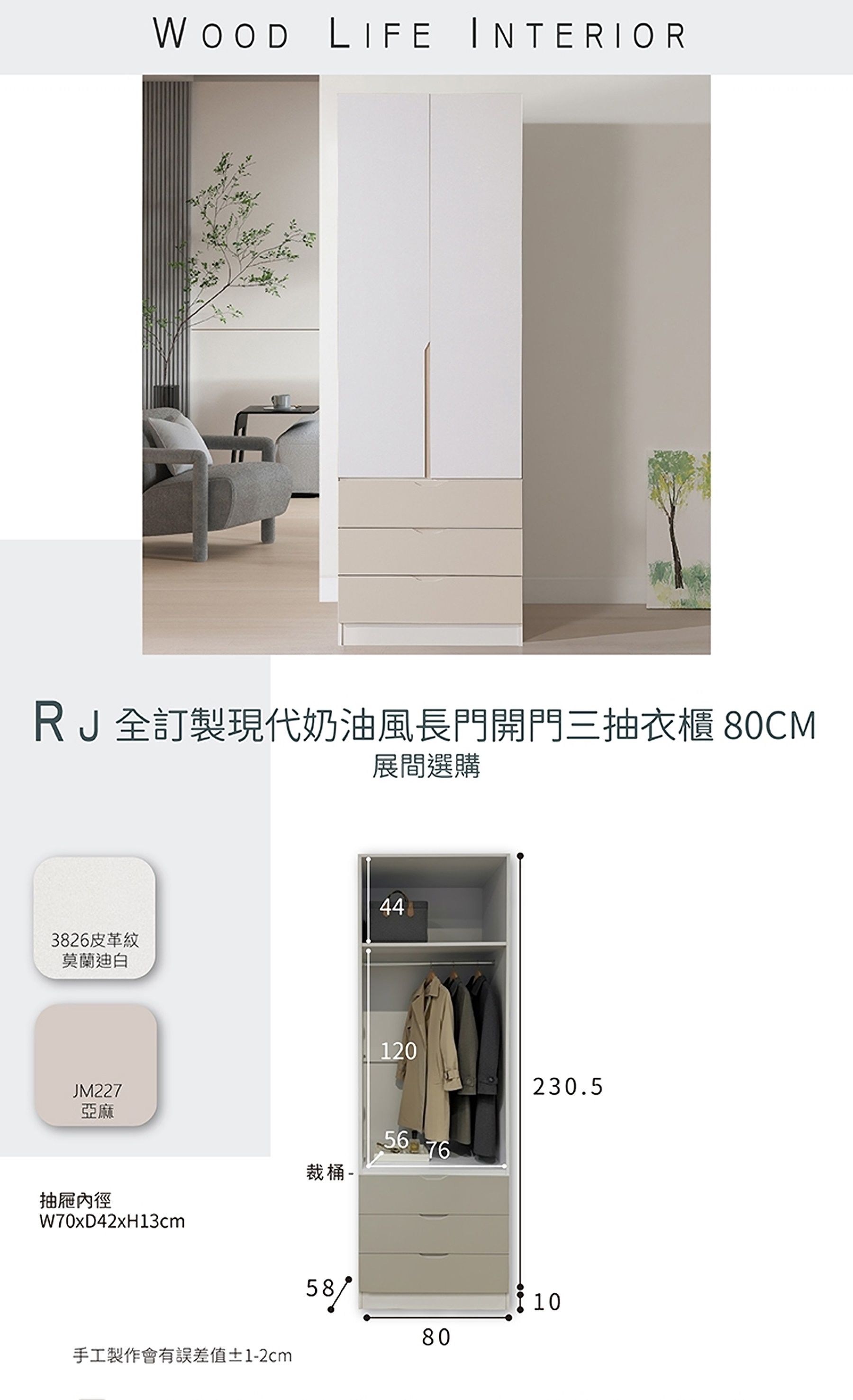 【限定門市選購】RJ 全訂製現代奶油風80CM長門開門三抽衣櫃